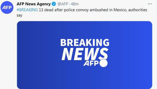 据法新社刚刚消息,一警察车队18日在墨西哥中部遭到犯罪团伙伏击,造成至少13人死亡。