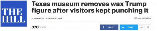 【环球网报道 见习记者 康博浩】拿蜡像“撒气”?据《国会山报》18日报道,美国得克萨斯州圣安东尼奥市中心的一家蜡像馆将美国前总统特朗普的蜡像移走,原因是该蜡像反复遭到破坏。