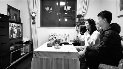大年三十,《千手观音》舞者吕晓燕(左)与丈夫一起观看春晚。资料图片
