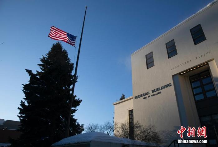 当地时间3月18日,美国阿拉斯加州安克雷奇市一处联邦建筑降半旗。美国总统拜登当日下令全美范围内的联邦建筑降半旗,以纪念亚特兰大枪击事件中的遇难者。中新社记者 刘关关 摄