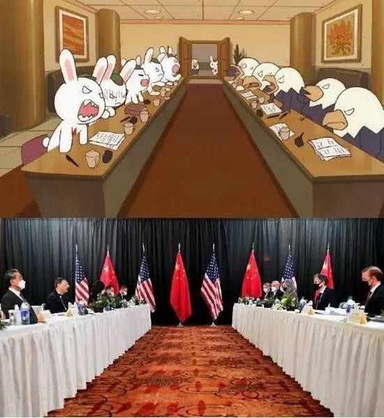 ——与照片一同刷屏的还有一幅漫画。动画片《那年那兔那些事儿》中的一幕与对话现场照片颇为相似,漫画反映的历史事件发生于1955年的中美大使级会谈,当时中美达成两国平民回国协议。