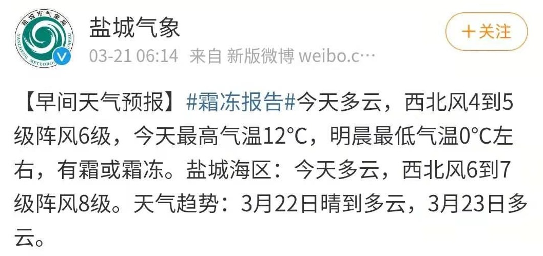 今天早上,盐城气象微博发布霜冻报告,明晨最低气温0℃左右,有霜或霜冻。