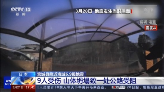 在宫城县盐釜市,20日的地震造成当地一公路附近山体发生坍塌,当时停在附近的一辆汽车内的车载记录仪拍到了这一瞬间。
