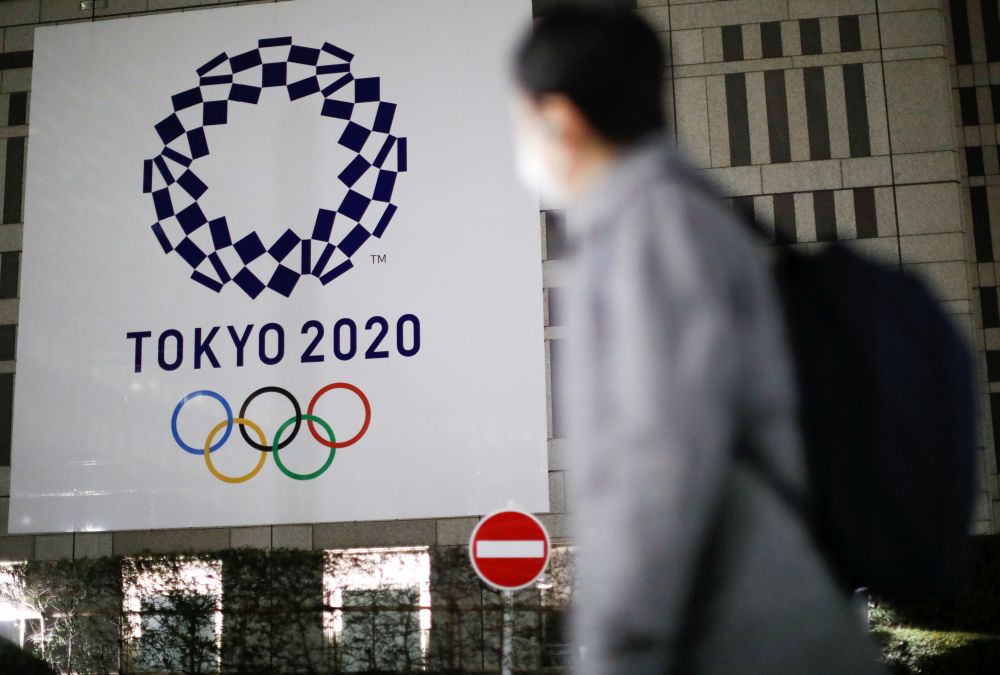 一名戴口罩的行人从挂有东京奥运会标志海报的日本东京都厅大楼前走过。新华社/路透