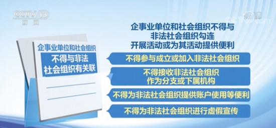 通知要求:企事业单位和社会组织不得与非法社会组织勾连开展活动或为其活动提供便利;不得参与成立或加入非法社会组织;不得接收非法社会组织作为分支或下属机构;不得为非法社会组织提供账户使用等便利;不得为非法社会组织进行虚假宣传。对违反上述要求的社会组织、企业和其他单位,将依法从严从重处罚。