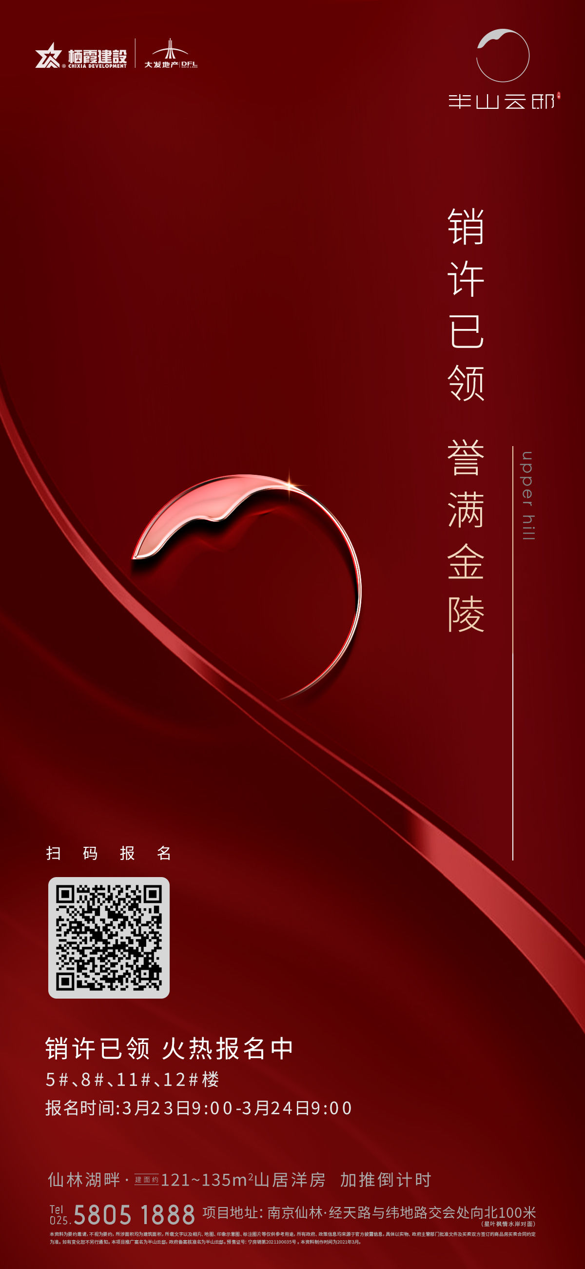 作为仙林湖板块唯一在售的山居洋房,在地段、产品、户型三大绝对理由加持下,仙林首选半山!5、8、11、12幢楼销许已领,仅169套房源,3月23日上午9:00开始报名!