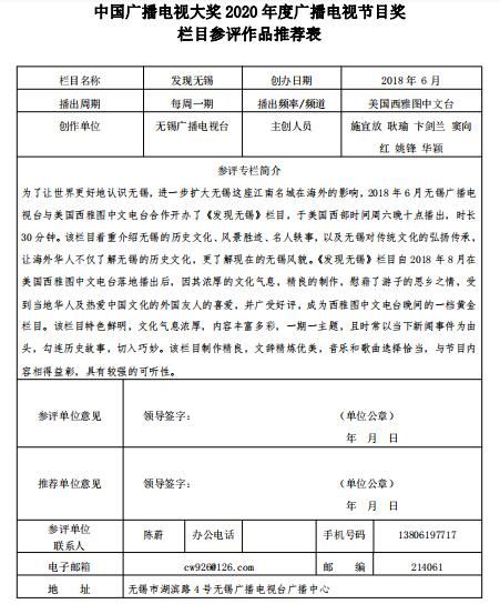 为了让世界更好地认识无锡,进一步扩大无锡这座江南名城在海外的影响,2018年6月无锡广播电视台与美国西雅图中文电台合作开办了《发现无锡》栏目,于美国西部时间周六晚十点播出,时长30分钟。该栏目着重介绍无锡的历史文化、风景胜迹、名人轶事,以及无锡对传统文化的弘扬传承,让海外华人不仅了解无锡的历史文化,更了解现在的无锡风貌。该栏目以专题形式制作播出,一期一主题,且时常以当下新闻事件为由头,勾连历史故事,切入巧妙。该栏目制作精良,文辞精炼优美,音乐和歌曲选择恰当,与节目内容相得益彰,特色鲜明,文化气息浓厚,可听性强。