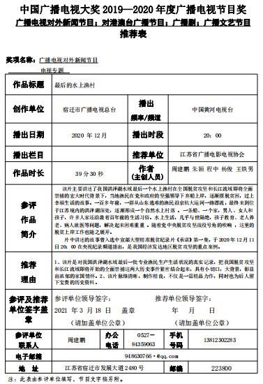 电视专题片《最后的水上渔村》立项于2018年1月,3月份正式开机拍摄,从节目立项到摄制完成播出,整个过程历时近3年,是生态扶贫的重点案例。该片主要讲述了我国洪泽湖水域最后一个水上渔村在全国脱贫攻坚和长江流域即将全面禁捕的宏大时代背景下,当地渔民在党和政府的坚强领导下弃船上岸,逐渐摆脱贫困,过上幸福生活的故事。