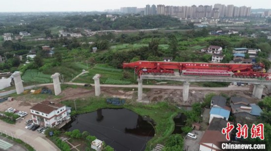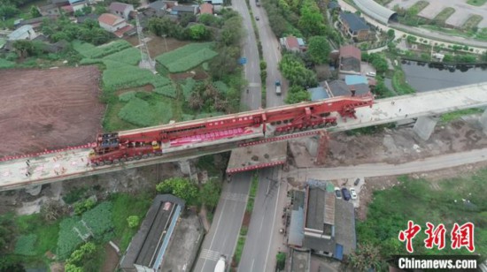 釜溪河双线特大桥上运架一体机正在开展架梁作业。周大要摄