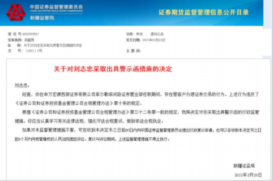 上述行为违反了《证券公司和证券投资基金管理公司合规管理办法》第六条第(四)项的规定。根据《证券公司和证券投资基金管理公司合规管理办法》第三十二条第一款的规定,新疆证监局决定对申万宏源西部证券有限公司库尔勒滨河路证券营业部采取出具警示函的行政监管措施。涉事员工刘志忠采取出具警示函措施的决定。