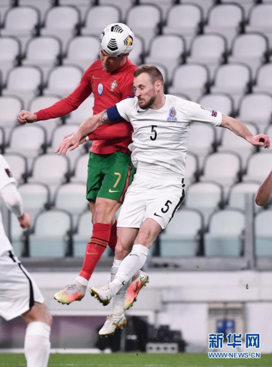 3月24日,葡萄牙队球员克·罗纳尔多(左)在比赛中和阿塞拜疆队球员梅德韦杰夫争顶。新华社发(费代里科·塔尔迪托 摄)