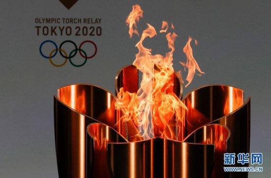 3月25日,东京奥运圣火在圣火盆中燃烧。新华社/POOL/金敬勋