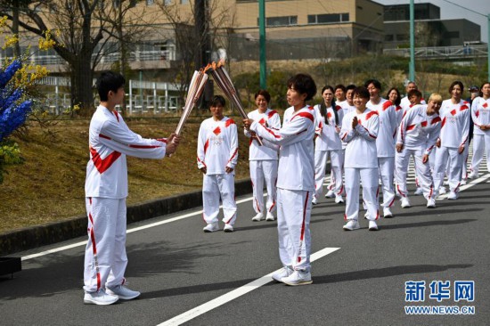 3月25日,日本前女足队成员在火炬传递中。新华社记者杜潇逸摄
