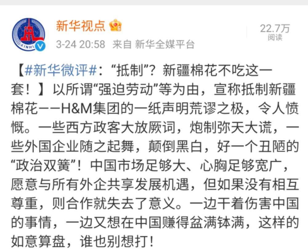 日前,H&M集团发布声明称,他们不与位于新疆的任何服装制造工厂合作,也不从该地区采购产品/原材料。