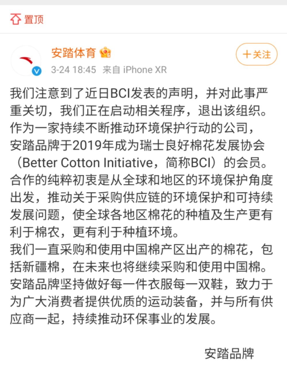 并表示:安踏体育一直采购和使用中国棉产区出产的棉花,包括新疆棉,在未来也将继续采购和使用中国棉。