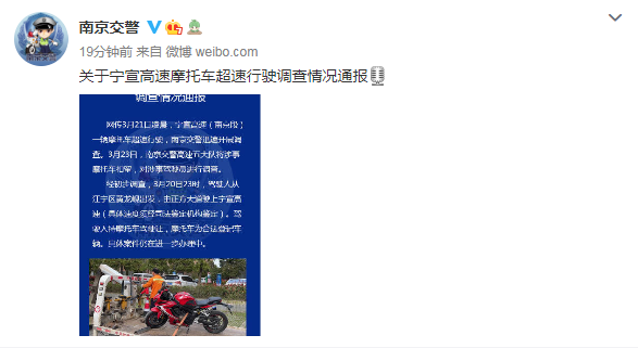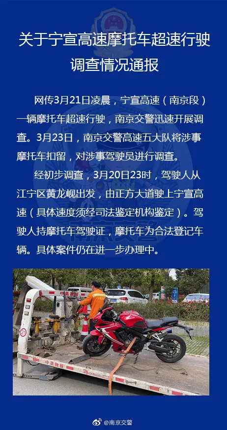 3月22日,网上流传一段3月21日凌晨,宁宣高速(南京段)一辆摩托车超速行驶的视频。为保障道路交通和广大人民群众生命财产安全,依法打击违法犯罪行为,根据相关法律法规,南京交警立刻对相关车辆、人员开展调查。