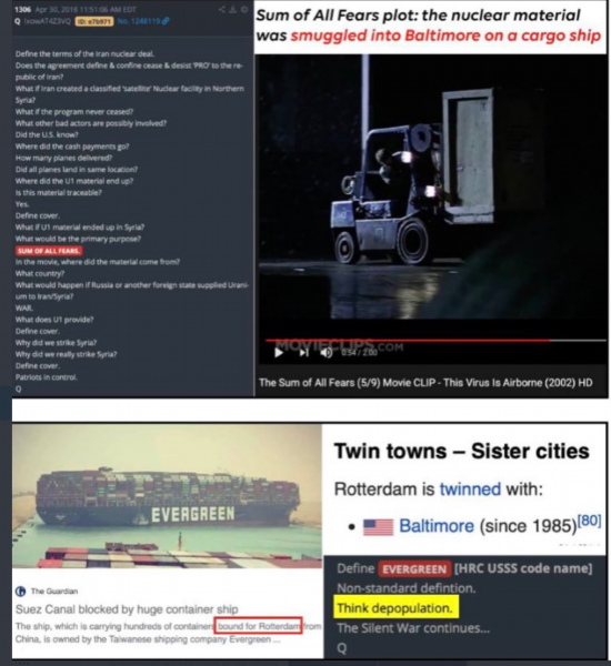 图为Qanon分子在网络上传播的关于货轮是给希拉里贩卖幼童的“阴谋论”