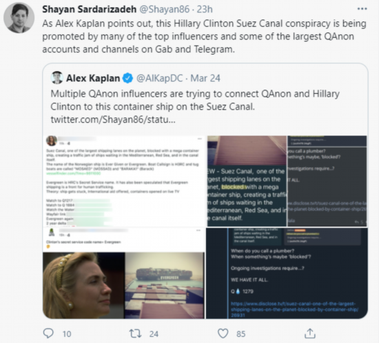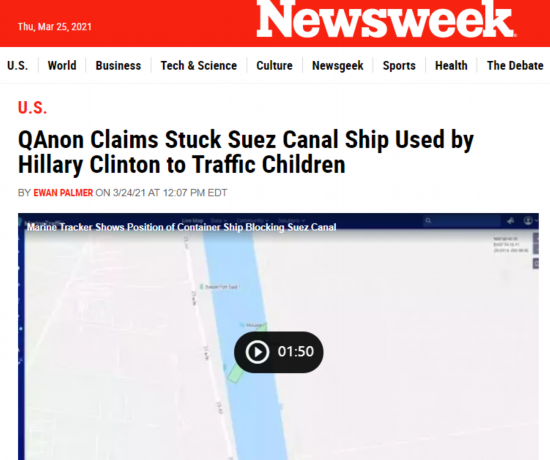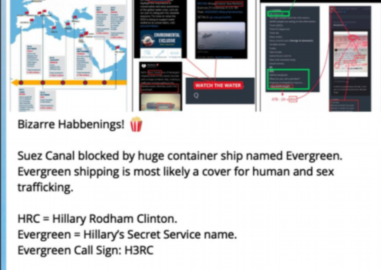 总之,一个中国台湾的大型货轮不慎在苏伊士运河搁浅的事情,就这样被美国这群极右翼网络阴谋论者“凭空编造”成了一个中国帮希拉里等美国吃人的恋童癖精英贩卖幼童的恐怖事件……