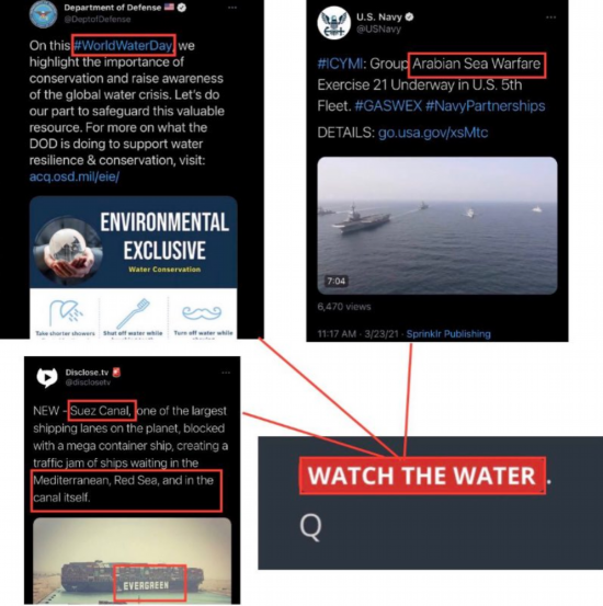 他们还宣称货轮出事当天是“世界水日”,且这个旨在呼唤人们节约用水、保护水资源的节日又被多个美国政府的账号提及,所以他们更认定那艘中国台湾的货轮在苏伊士运河上出事是有“阴谋”的。