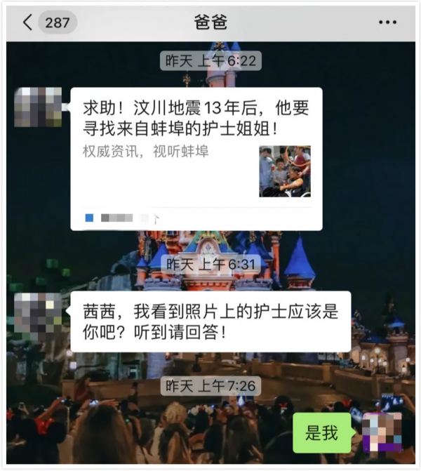 护士姐姐沈茜茜告诉记者,23日早上,在老家的爸爸收到了刘安权寻找护士姐姐的新闻推送,转发给她确认。