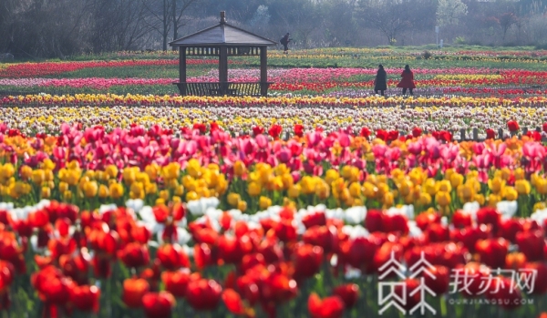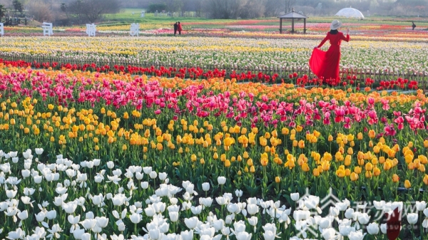据了解:今年这里根据不同的花不同的颜色,分批种植了100多亩200万株郁金香,品种主要有世界之窗、小黑人等40个品种。
