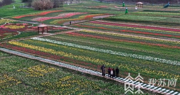 正是一年春光好,五彩花田醉游人,这两天,江苏句容后白镇岩藤农场里的200万株郁金香进入了盛花期,姹紫嫣红的花儿争奇斗艳,如同“彩虹地毯”将大地装扮得美不胜收。从空中俯瞰,只见两只巨型“蝴蝶”图案在花田里逐渐呈现出来,栩栩如生,展翅欲飞。农场负责人徐进告诉记者,这两只巨型“蝴蝶”是今年他们特别设计的,由8种颜色的郁金香组成,长、宽分别达到20多米。人们来到这里能感受到一个“蝴蝶飞舞、鲜花绽放”不一样的春天。