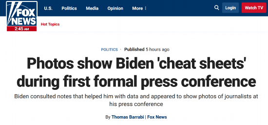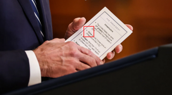 【环球网报道 见习记者 杨英琦】拜登首场记者会上用的“小抄”被曝光了。据福克斯新闻报道,在25日举行的上任后首场新闻记者会时,拜登还准备了“小抄”。报道提到,现场照片显示,拜登手握的一张“小抄”上,还清晰可见“中国”。