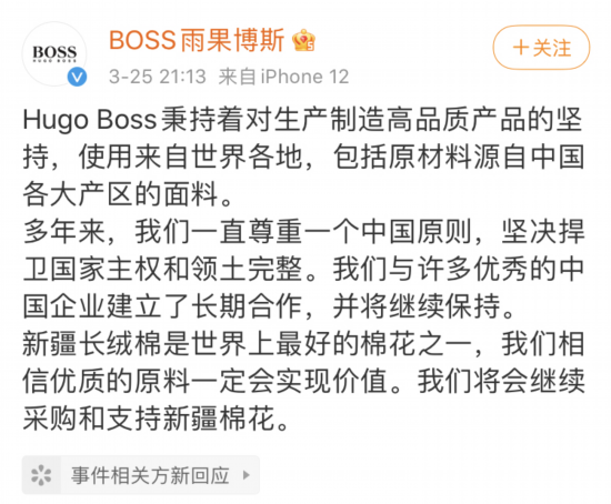 25日晚,BOSS雨果博斯在微博的一份声明中称,“Hugo Boss秉持着对生产制造高品质产品的坚持,使用来自世界各地,包括原材料源自中国各大产区的面料。”声明还提到,“新疆长绒棉是世界上最好的棉花之一,我们相信优质的原料一定会实现价值。我们将会继续采购和支持新疆棉花。”