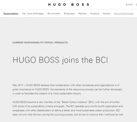 根据Hugo Boss官网2017年5月公布的信息,该公司加入BCI组织,称“为了促进创建一个更可持续的产业。”