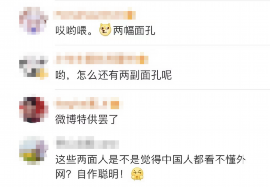 有网友讽刺说,“哟,怎么还有两幅面孔呢?”也有网友称,“微博特供罢了。”还有网友称,“这些两面人是不是觉得中国人都看不懂外网?自作聪明!”