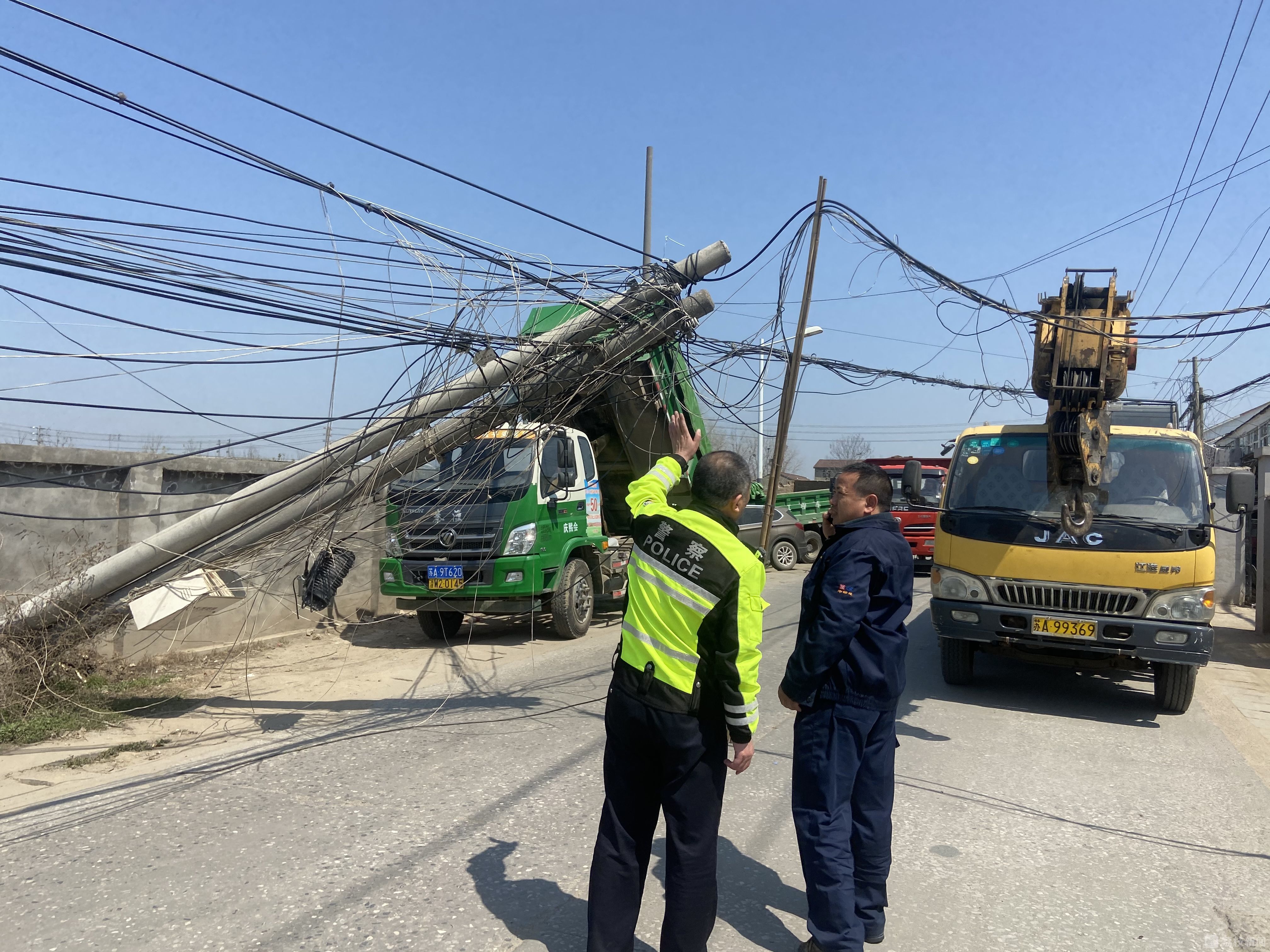 今天上午10:30左右,南京市秦淮区双麒路上,一辆搅拌车在由南向北路行驶中,因为车辆超高拉断电线杆,电线杆倾斜压在正在维修的五小工程车上。