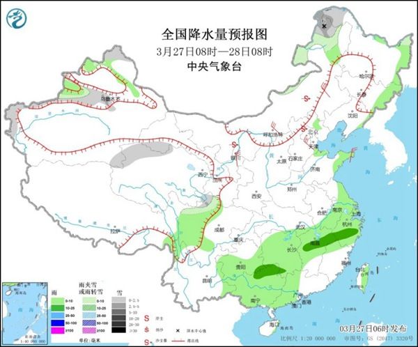 预计,今(3月27日)明天北方降水区域明显缩减,南方大部仍春雨缠绵。另外,受蒙古气旋东移影响,今明天北方将再度出现大范围沙尘天气,内蒙古中西部、陕西北部、山西北部、河北中北部、北京、天津、辽宁西部等地的部分地区有沙尘暴,公众外出需注意防范。