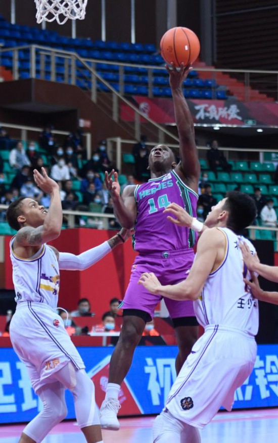 3月26日,山东西王队球员哈德森(中)在比赛中上篮。新华社记者 黄宗治 摄