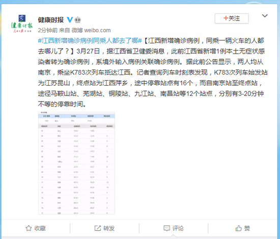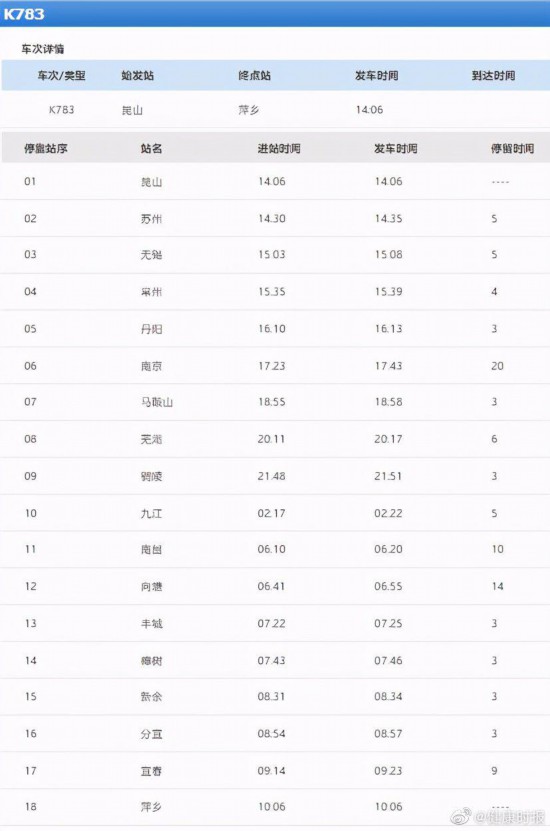 3月27日,据江西省卫健委消息,此前江西省新增1例本土无症状感染者转为确诊病例,系境外输入病例关联确诊病例。据此前公告显示,两人均从南京,乘坐K783次列车抵达江西。记者查询列车时刻表发现,K783次列车始发站为江苏昆山,终点站为江西萍乡,途中停靠站点有16个,而自南京站至终点站,途径马鞍山站、芜湖站、铜陵站、九江站、南昌站等12个站点,分别有3-20分钟不等的停靠时间。