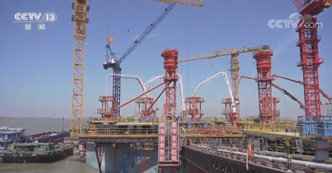 中铁大桥局常泰长江大桥6号墩沉井技术负责人 魏晓宁:我们6号墩沉井长是95米,宽是57.8米,高64米,我们这个6号墩的封底混凝土是从今年的2月份开始浇筑,截止到现在累积浇筑49000立方米。