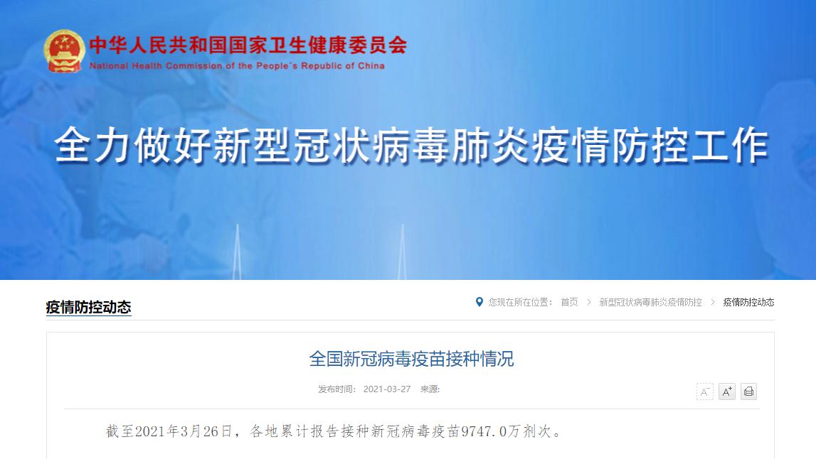 据国家卫健委官网27日消息,截至2021年3月26日,各地累计报告接种新冠病毒疫苗9747.0万剂次。