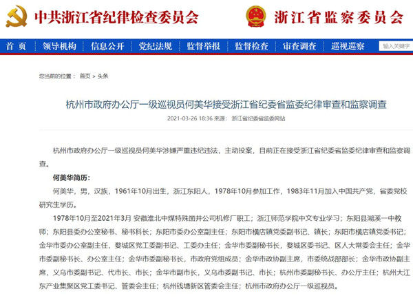 荔枝新闻讯 浙江省纪委监委3月26日发布消息:杭州市政府办公厅一级巡视员何美华涉嫌严重违纪违法,主动投案,目前正在接受浙江省纪委省监委纪律审查和监察调查。