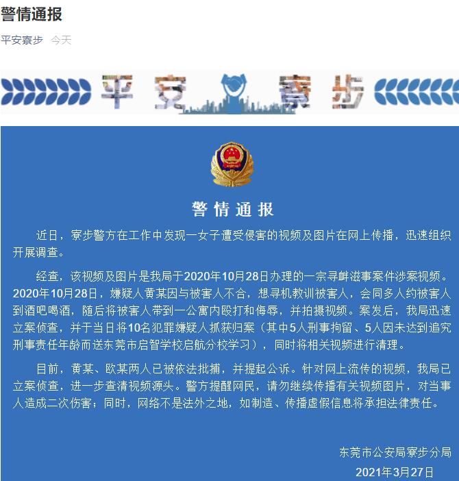 前述寮步分局警情通报称,2020年10月28日,嫌疑人黄某因与被害人不合,想寻机教训被害人,会同多人约被害人到酒吧喝酒,随后将被害人带到一公寓内殴打和侮辱,并拍摄视频。目前,黄某、欧某两人已被依法批捕,并提起公诉。针对网上流传的视频,该局已立案侦查,进一步查清视频源头。警方提醒网民,请勿继续传播有关视频图片,对当事人造成二次伤害;同时,网络不是法外之地,如制造、传播虚假信息将承担法律责任。