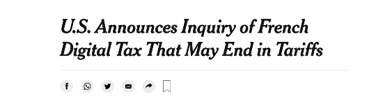 2019年,法国通过数字税计划,征税对象主要涉及苹果、脸书、亚马逊等美国科技巨头。随后,美国政府以“法国不公平对待美国企业”为由,于2019年7月对法国数字服务税发起“301调查”。