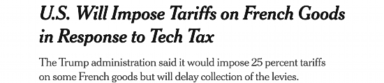 △华尔街日报:美国将对法国商品征收关税 以回应法国征收数字税