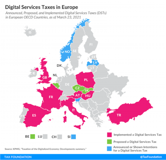 美国税收基金会( Tax Foundation )网站的公开信息显示,截至2021年3月23日,奥地利、法国、匈牙利、意大利、波兰、西班牙、土耳其和英国等八国已实施征收数字税;比利时、捷克、斯洛伐克已形成征收数字税的提案;拉脱维亚、挪威、斯洛文尼亚已宣布或表示征收数字税的意图。