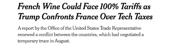 △华尔街日报:因数字税美国与法国对抗 法国葡萄酒或面临100%的关税