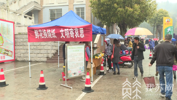 隐龙山墓园今天同样迎来祭扫高峰,全天祭扫人数将突破3万人。截至目前,园内60%以上的墓穴已经完成了祭扫。南京隐龙山墓园副经理刘玥表示 :“针对不能回宁祭扫的家属,我们墓园会在4月3日有一个集体公祭的仪式,现场我们会敬献花篮,有一个三献礼的仪式,可以代表我们墓园对这些逝者表达一个哀思。”面对清明祭扫高峰,今天,镇江市殡葬管理处组织志愿者60多人维护现场秩序。为倡导绿色祭扫,市民可以在现场用纸钱免费换鲜花。