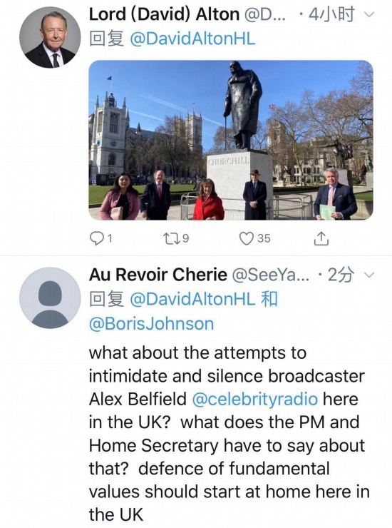在上议院议员戴维-埃尔顿的推文下,一名网民说:“坚守基本的价值观应该从英国的家门口做起,你们为什么试图噤声一名广播从业者,首相和内政大臣对此有什么说的?”