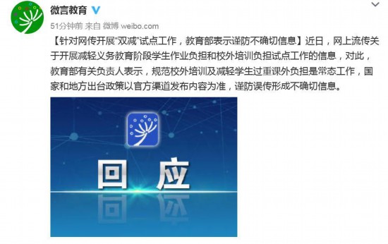 据教育部官方微博“微言教育”消息,针对网传开展“双减”试点工作,教育部表示谨防不确切信息。