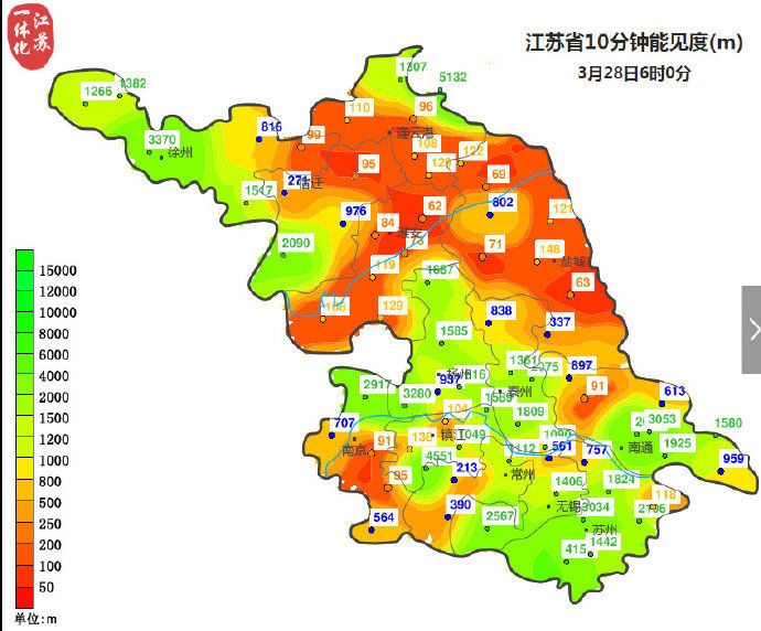 江苏省气象台2021年03月28日06时16分发布大雾橙色预警信号:目前徐州南部,连云港,宿迁北部,淮安,盐城,镇江北部,南京,南通北部已出现能见度小于200米的强浓雾。预计未来6小时,徐州南部,连云港,宿迁北部,淮安,盐城,镇江北部,南京,南通北部仍将出现浓雾或强浓雾,局部地区可能出现小于50米的特强浓雾,请注意防范。