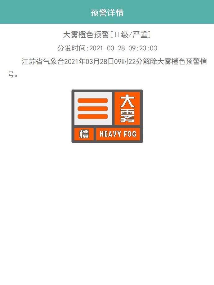 我苏网讯 江苏省气象台2021年03月28日09时22分解除大雾橙色预警信号。据省交通综合执法局消息,3月28日08:20,高速公路因雾霾特级管制均已解除,道路通行逐步恢复正常。