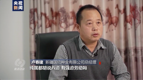 新疆国欣种业有限公司总经理卢春建:纯属胡说八道。我不知道他说这个话的目的是看到了还是听到了,还是胡言乱语,说这个话是不是有什么目的。今年招聘的时候,本来应该是八十多个人,来了将近一百六七十个人。我们要是强迫劳动,会来这么多人吗,会这么积极吗?