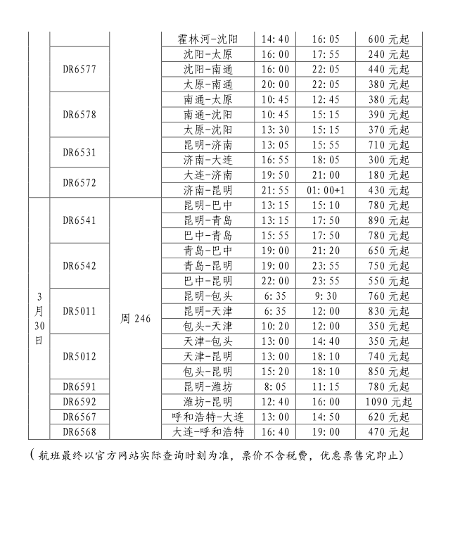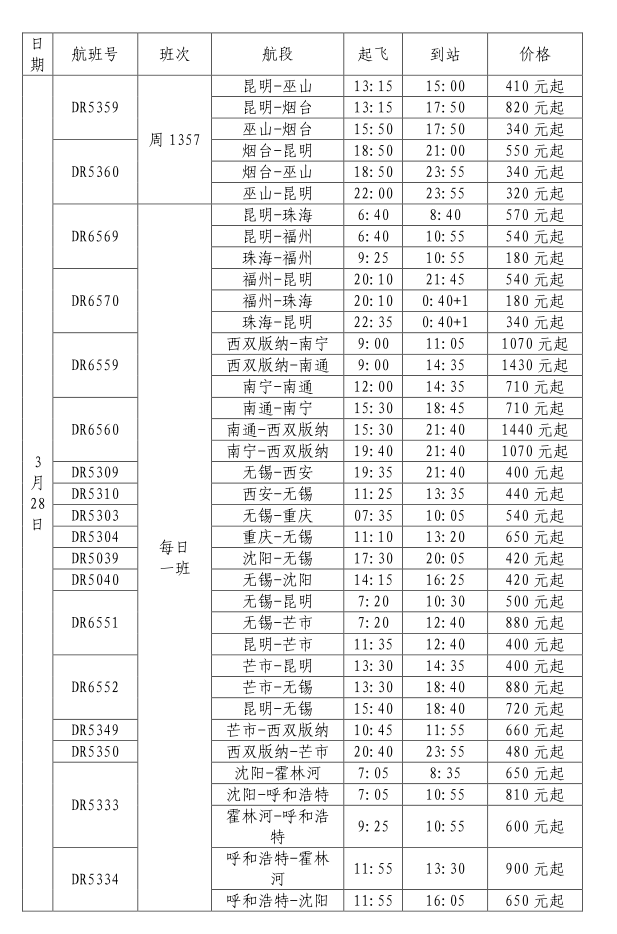 自3月28日起,瑞丽航空持续开通“无锡=昆明=芒市”, “无锡=重庆”,“无锡=西安”, “无锡=沈阳”, “昆明=包头=天津”, “昆明=巴中=青岛”,“昆明=潍坊”,“昆明=巫山=烟台”, “昆明=珠海=福州”,“昆明=济南=大连”, “沈阳=霍林河=呼和浩特”,“沈阳=太原=南通”, “芒市=西双版纳”,“西双西双版纳=南宁=南通”,“呼和浩特=大连”等15条国内航线。航班均由波音737型客机执飞。