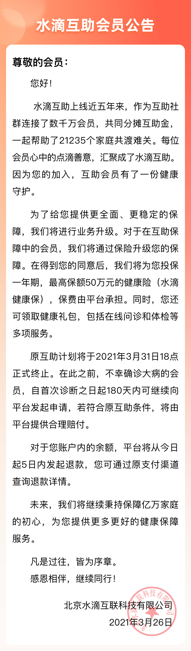 3月26日,水滴互助发布公告称,水滴互助计划将于2021年3月31日18时正式终止。在此之前,不幸确诊大病的会员,自首次诊断之日起180天内,可继续发起申请,若符合原互助条件,将由平台提供合理赔付。对于用户账户内的余额,平台将从公告日起5日内发起退款。